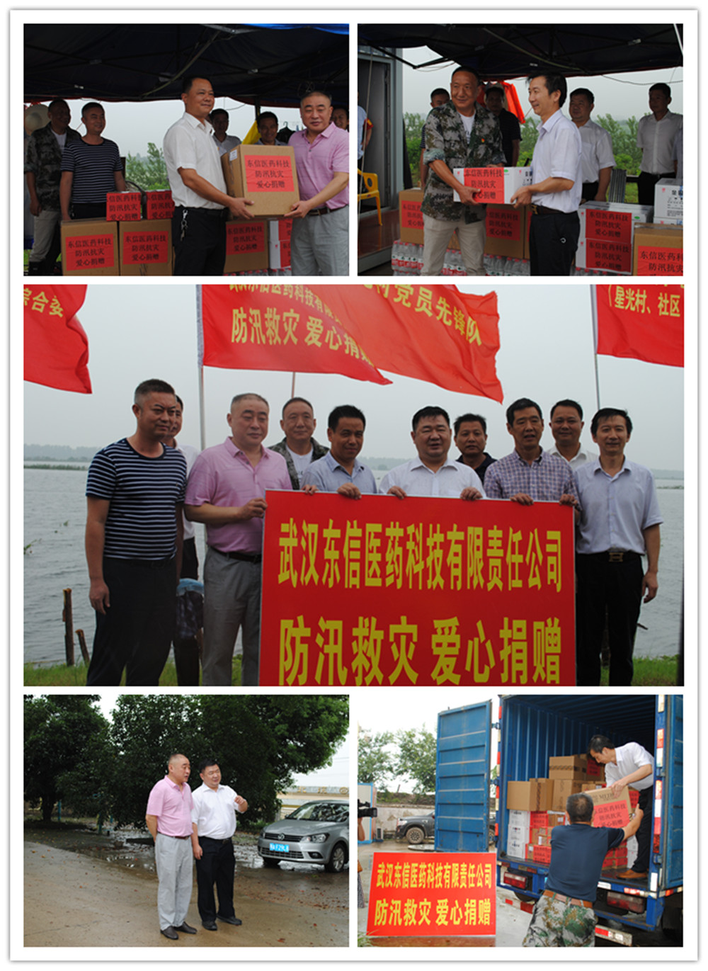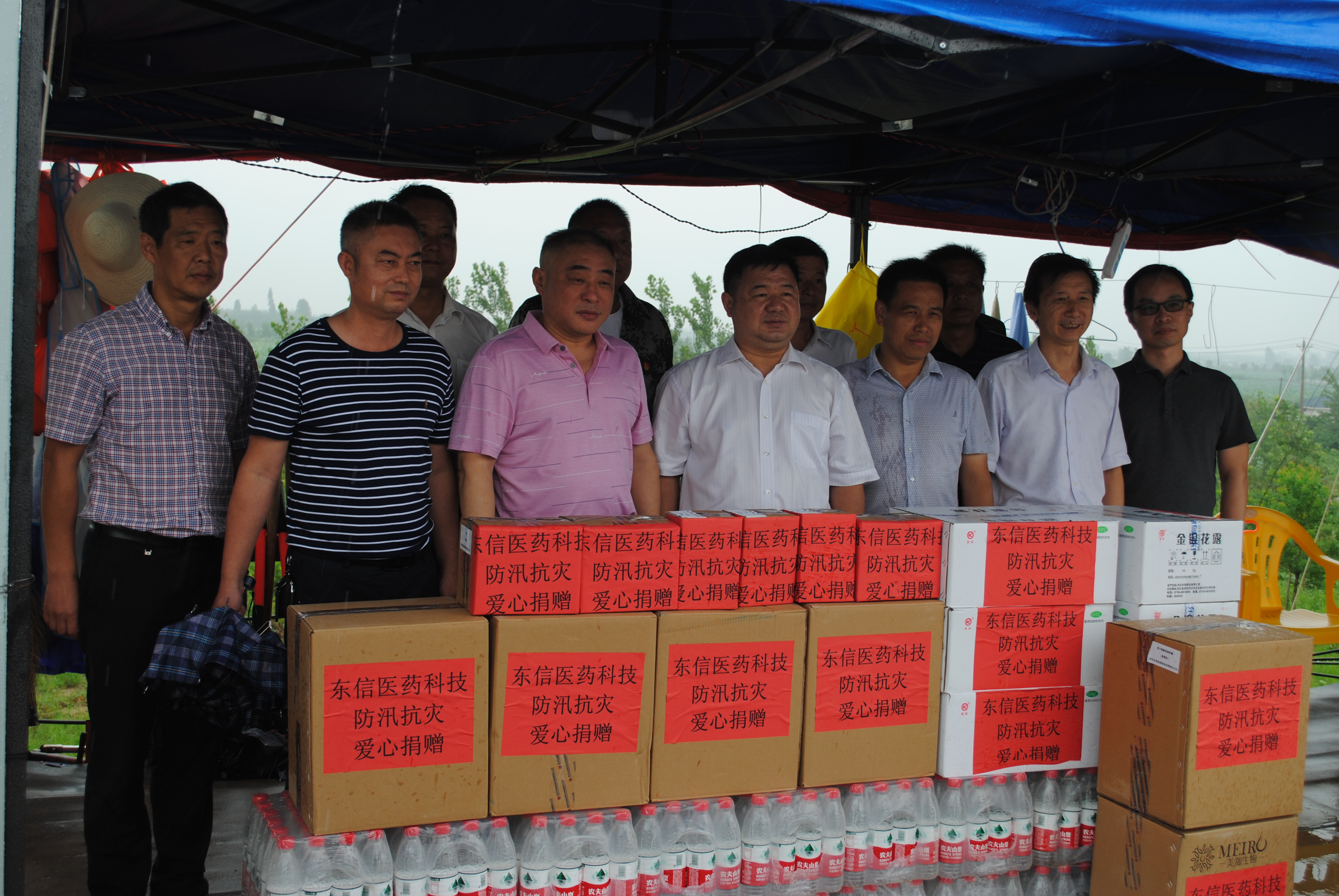 7月21日,蔡甸區(qū)政協(xié)胡朝暉主席,區(qū)委常委區(qū)委統(tǒng)戰(zhàn)部許永周書記、政協(xié)秘書長鄒國棟、永安街黨工委書記計文華、蔡甸區(qū)經(jīng)濟開發(fā)區(qū)奓山街辦公室主任袁志凡、蔡甸區(qū)科技和經(jīng)濟信息化局周長飛總工,蔡甸區(qū)奓山街黨工委副書記熊光輝等和武漢東信醫(yī)藥科技有限責任公司總經(jīng)理陳長根、黨支部書記劉文富、質(zhì)量總監(jiān)黃鳳起、研發(fā)總監(jiān)鄭學文等一道,冒著大雨,驅(qū)車往返近百公里,向不分晝夜、堅守在防汛一線的抗洪防汛人員送去了復方氨酚烷胺膠囊、金銀花露、蟲咬凝膠、植物驅(qū)蚊水、止癢酊等價值近22萬元的防暑降溫、驅(qū)蚊止癢的藥品和物資。