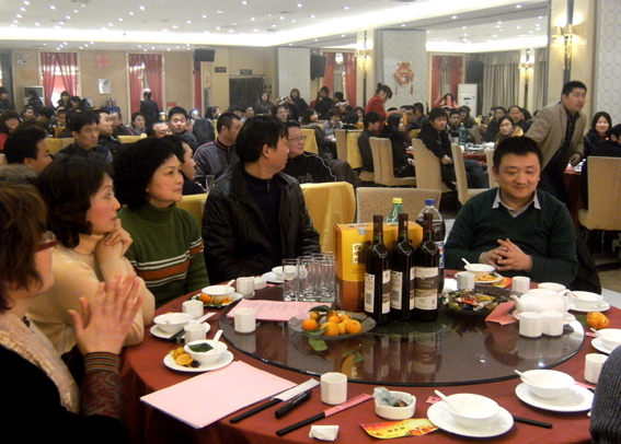 2011年的1月27日是中國(guó)傳統(tǒng)的小年夜,武漢荔灣美食城張燈結(jié)彩、鼓樂(lè)齊鳴。門(mén)外的漢口鬧市街頭也是燈光璀璨,令人眼花繚亂的燈飾、景觀紛紛亮相,將節(jié)日里的江城裝扮得更加美麗迷人。在一派喜慶、祥和的氣氛中,從市場(chǎng)一線歸來(lái)的營(yíng)銷(xiāo)將士和總部各職能部門(mén)的干部職工共150人歡聚一堂,舉杯同慶,共同回顧、總結(jié)2010年度的工作,表彰先進(jìn),迎接新春佳節(jié)的到來(lái)。