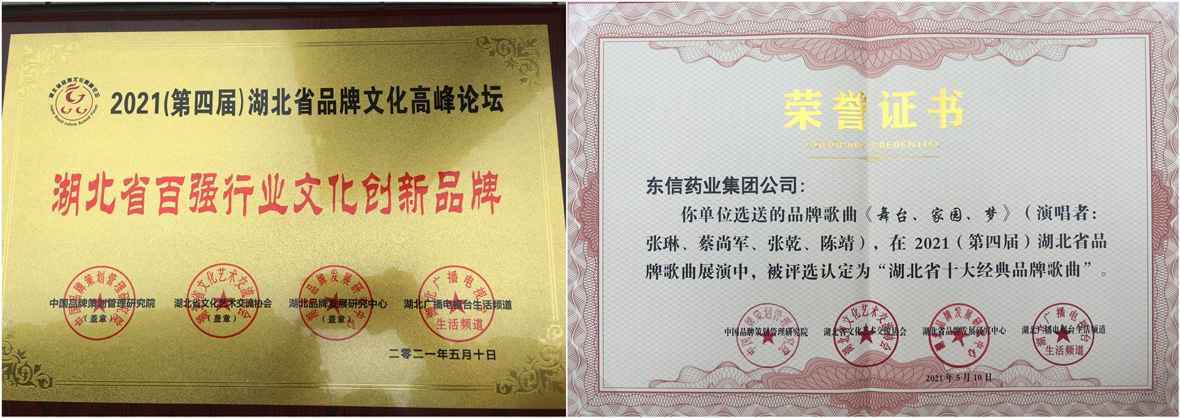 2021年5月10日,2021(第四屆)湖北省品牌文化高峰論壇在武漢空中花果山影視城隆重舉行。在論壇和“品牌歌曲、品牌故事展演會(huì)”的頒獎(jiǎng)環(huán)節(jié),東信醫(yī)藥集團(tuán)“雙喜臨門”,分別摘得“湖北省百強(qiáng)行業(yè)文化創(chuàng)新品牌”和“2021(第四屆)湖北省十大經(jīng)典品牌歌曲”兩項(xiàng)殊榮。